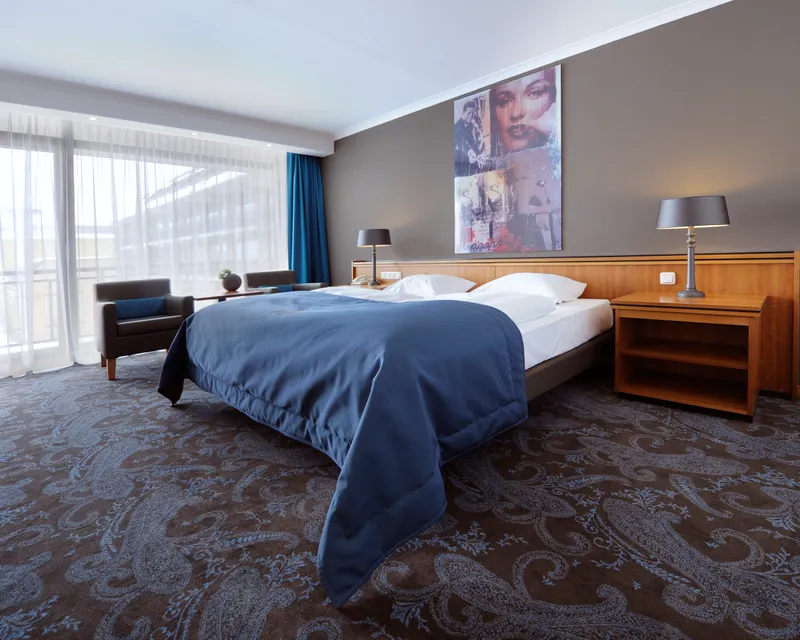 Living and sleeping area: carpet floor, double bed (twin), wardrobe, safe, flatscreen TV with German, Dutch and international program, 2 Sky channel free of charge, mini fridge with mineral water free of charge, air-conditioning, telephone, balcony or terrace.
