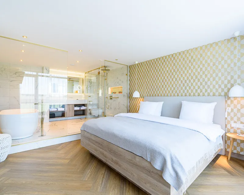 Inrichting woon-/slaapgedeelte: PVC-vloer, 1 kingsize bed (bedden niet scheidbaar / matrasafmetingen 1,80 x 2,10 m), kledingkast, kluis, koffie- en theefaciliteiten, 2 flatscreen-tv's met Duitse, Nederlandse en internationale zenders, 2 gratis Sky-kanalen, 2 minibars (tegen betaling), zelfregelbare airconditioning, bank, tafel met twee stoelen, telefoon, elektrische haard, balkon of terras